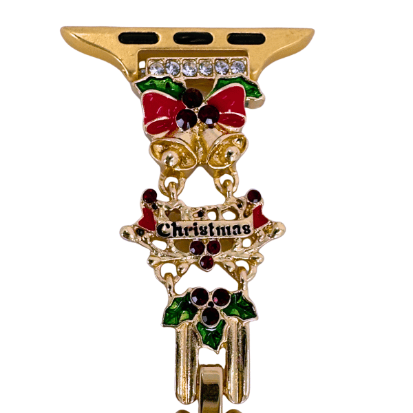 Designed to look like a delicate piece of jewellery, this gold-tone bracelet features sparkling crystal connectors that catch the light. It's finished with a set of durable, festive Christmas icons, including a bow, holly, and a 'Christmas' script. It's a look that’s pure holiday fun.